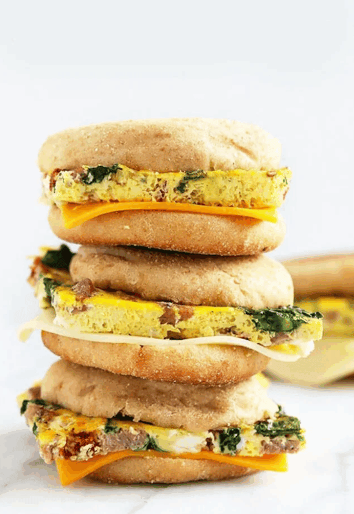 My go-to quick, grab-and-go freezer breakfast sandwiches. They’re made with sausage, sun-dried tomatoes, a spinach egg patty, cheese and a whole-grain English muffin.